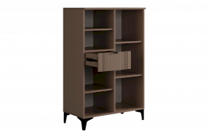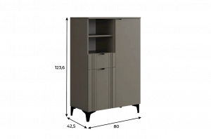 Дизайн комода продуман до мелочей: с одной стороны расположена глухая дверца, за которой скрывается просторное пространство для хранения. С другой стороны – ниша с открытой полкой, выкатной ящик и ещё одна глухая дверца, что позволяет гибко организовать хранение и поддерживать порядок в доме.