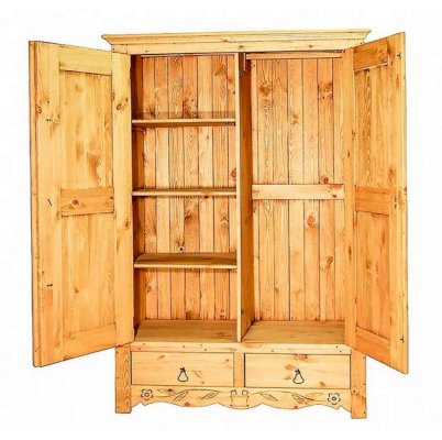Шкаф, сделанный с любовью к дереву, украшен резным цветочным орнаментом ручной работы. Расположенный в спальне, он сохранит большое количество одежды как на плечиках, так и на полках. Такой шкаф - настоящее украшение любой комнаты.