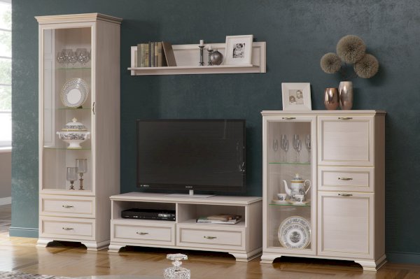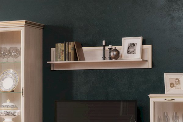 Настенная полка - это неизменный и важный атрибут гостиной спальни или детской комнаты. В модульной коллекции "Cиена" вы найдёте широкий выбор различных полок и сможете подобрать нужную именно вам модель. Представленный вам модуль универсален и подходит ко многим изделиям из коллекции. Декоративная отделка в виде фигурного профиля с золотой патиной подчеркивает классический стиль, а ЛДСП светлого оттенка «Бодега белый» с древесной текстурой подарит тепло и уют интерьеру спальни или гостиной.